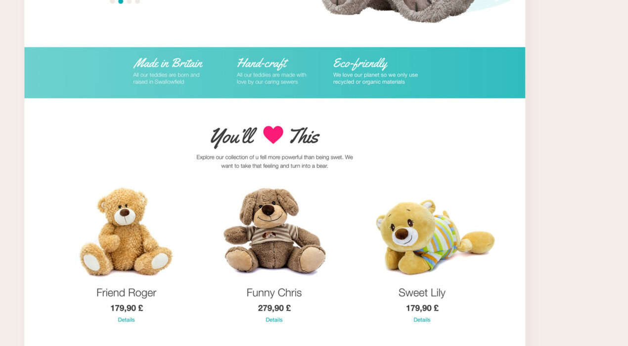 Projet personnel J’ai imaginé une entreprise anglaise centenaire de fabrication d’ours en peluche de qualité. Le challenge était de concevoir un site moderne, épuré, mettant en valeur la qualité des produits et proposer une version mobile. Expertise Identité visuelle UI / UX design Logiciels utilisés Sketch Adobe Photoshop Voir la présentation
