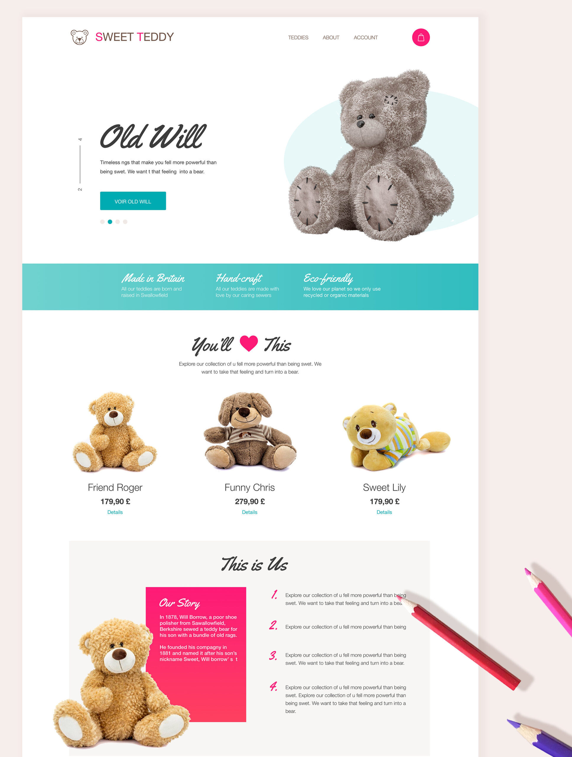 J’ai imaginé une entreprise anglaise centenaire de fabrication d’ours en peluche de qualité. Le challenge était de concevoir un site moderne, épuré, mettant en valeur la qualité des produits et proposer une version mobile.